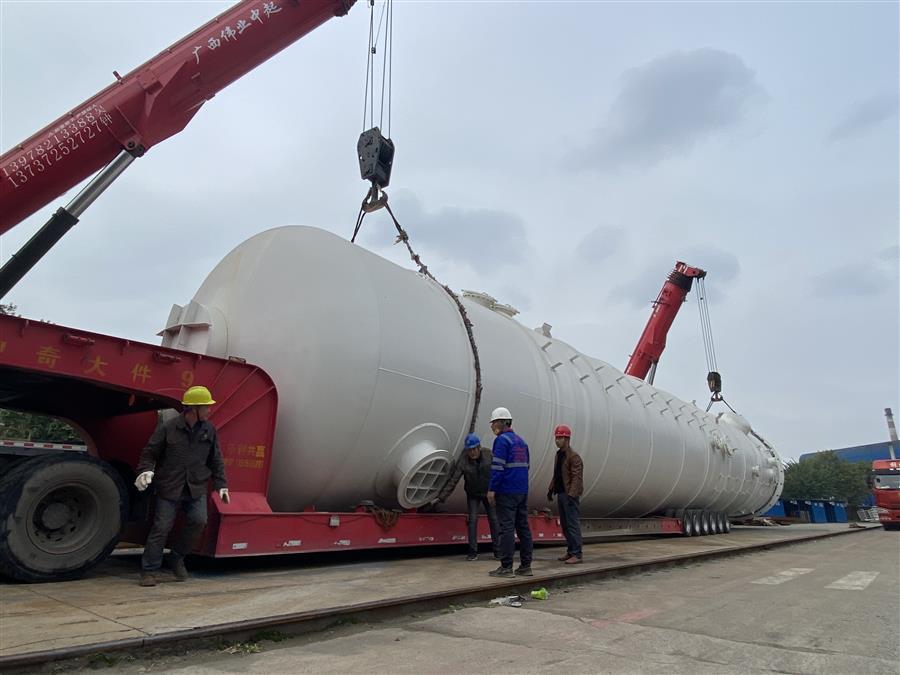 制造過程中,壓力容器制造廠在項目制造周期短、施工人力資源緊張的情況下,認真組織技術(shù)骨干進行施工,全力以赴順利按需完成了項目的交付任務。其中,空冷塔容積直徑4.2m,高(長)28.3m,重量約65噸;水冷塔直徑4.2m,長22.1m,重量約40噸。