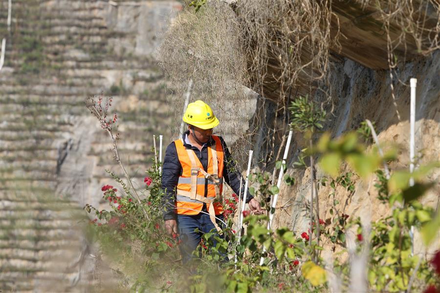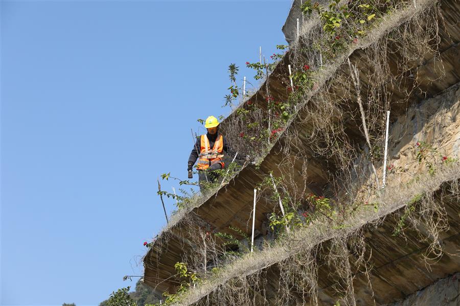 12月19日,一名工人在峭壁上護理綠植。