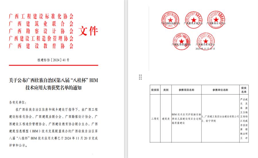 近日,廣西第八屆“八桂杯”BIM技術(shù)應(yīng)用大賽獲獎名單公布,冶建公司基礎(chǔ)分公司申報的《BIM 技術(shù)應(yīng)用護(hù)航融安融洲幼兒園建設(shè)項(xiàng)目全過程高質(zhì)量建設(shè)》榮獲施工組建筑類二等獎。