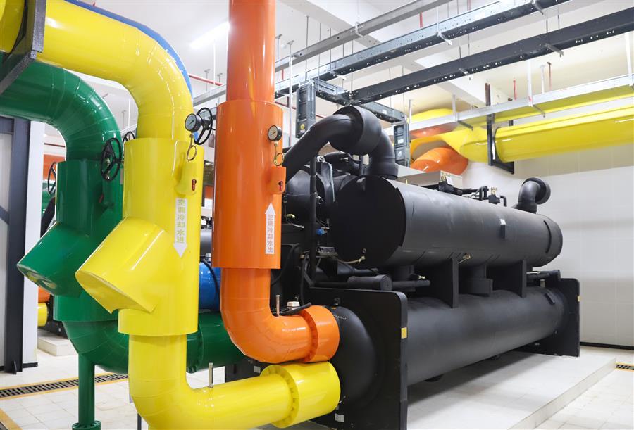 空調(diào)機房設備排布成排成行,空間合理,管線采用落地式共用管架。